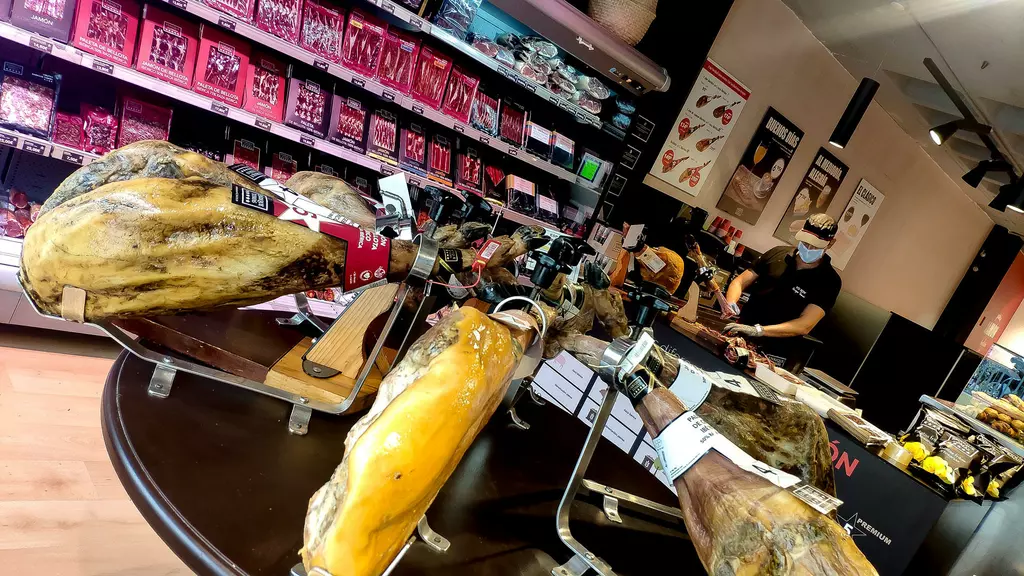 ESP:Jamonería diseñada para permitir a los visitantes descubrir el mundo del jamón en todos sus sabores y formatos, garantizando productos de calidad y una atención cálida y cercana. Puede encontrar una zona de tiendas con una amplia selección de jamones de diferentes procedencias, embutidos, quesos, vinos y otras especialidades y degustación de la zona de la barra.