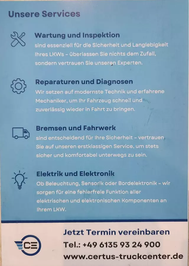 Unsere LKW-Werkstatt bietet umfassende Wartungs- und Reparaturdienste für Lastkraftwagen. Dazu gehören regelmäßige Inspektionen, mechanische und elektrische Reparaturen, Reifenservice, Karosserie arbeiten und Notfallpannenhilfe. Mit modernster Diagnosetechnik und einem erfahrenen Team sorgen wir dafür, dass Ihr LKW sicher und zuverlässig auf der Straße bleibt. Besuchen Sie uns für fachkundige Beratung und erstklassigen Service!