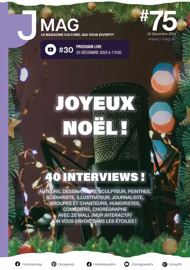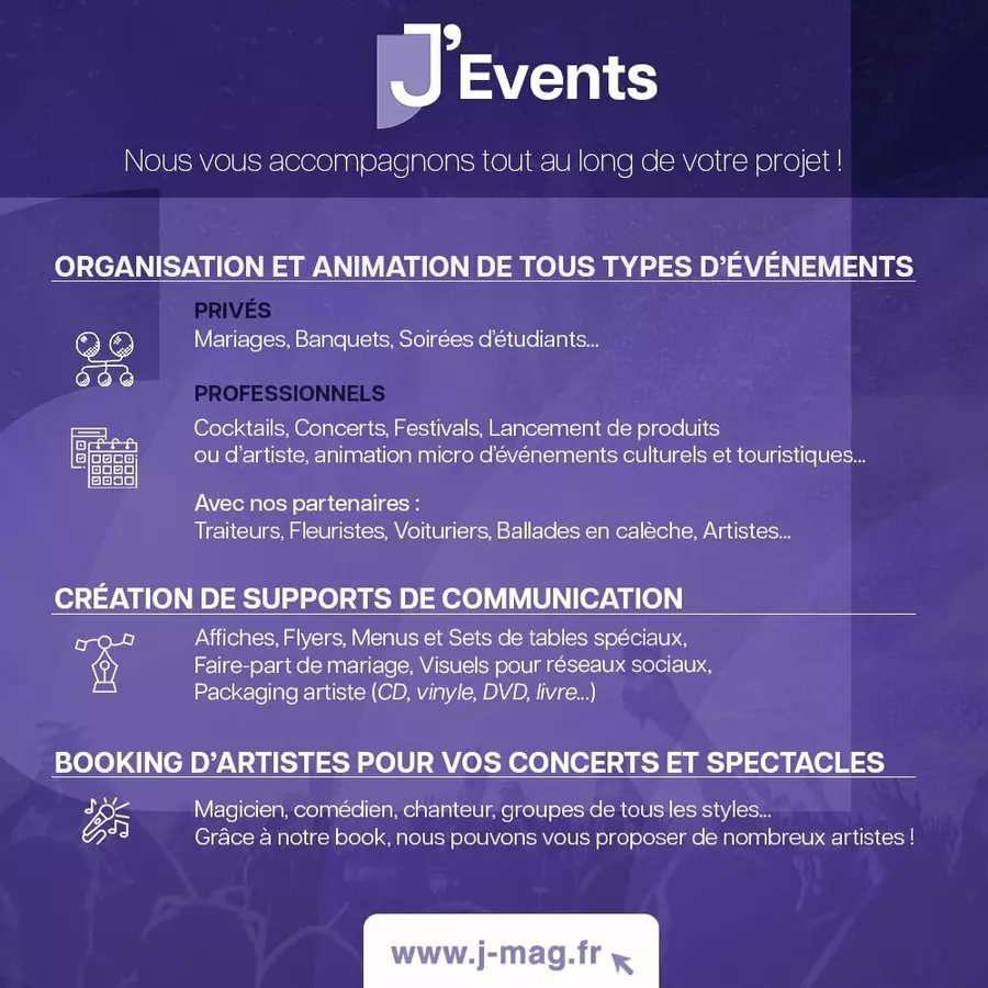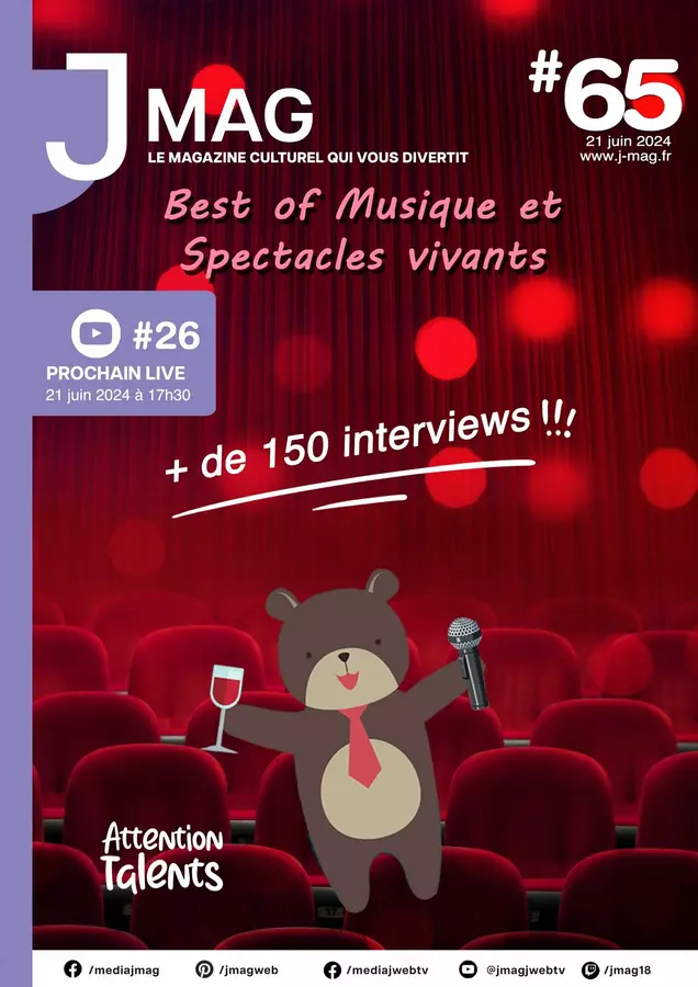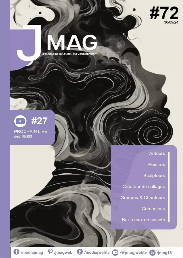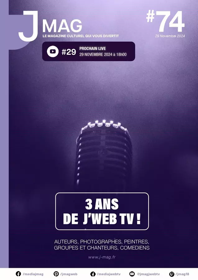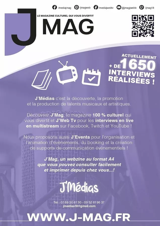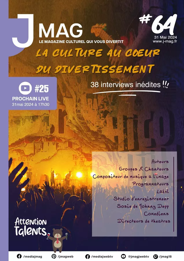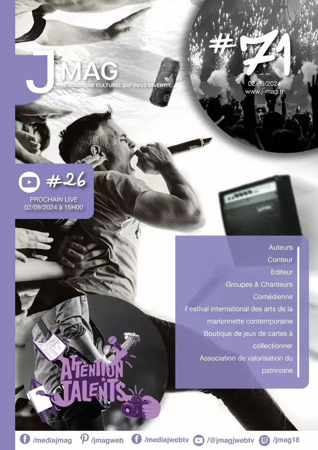 Découvrez J'Mag, le magazine alternatif 100 % culturel qui vous divertit et J'Web Tv pour les interviews en live visio multistream sur Facebook, Twitch et YouTube ! Nous proposons aussi J'Events pour l'organisation et l'animation d'évènements, du booking et la création de supports de communication événementiels !