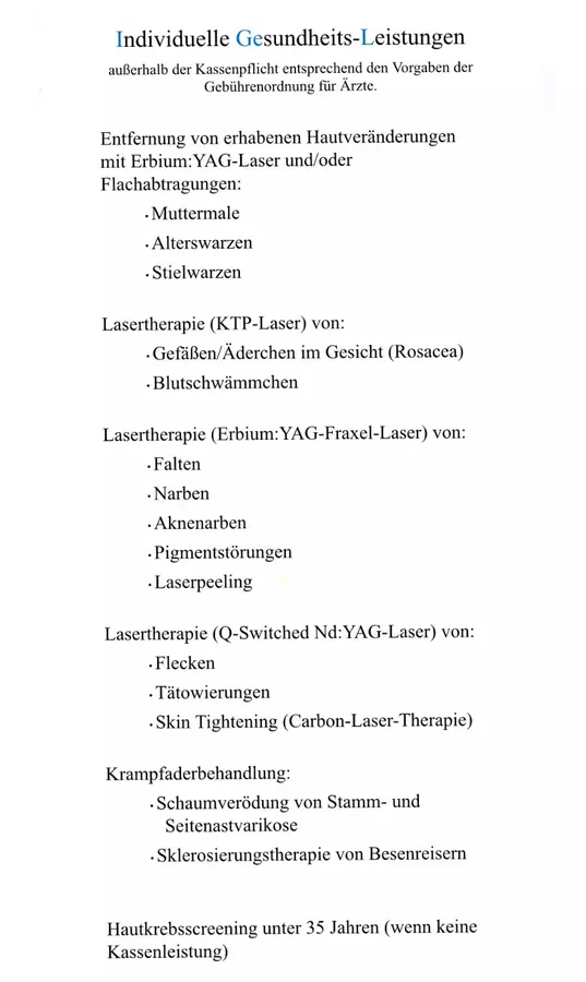 Die Ultraschalldiagnostik von Venenerkrankungen und deren Therapie mittels ambulanten Operationen, Schaumverödung und Sklerotherapie (Phlebologie). Die Entfernung und Lasertherapie von Muttermalen, Warzen und Hautkrebsvorstufen sowie die Lasertherapie von Gefäßen, Narben und Falten. Neu ist die Entfernung von Flecken und Tätowierungen sowie das Carbonpeeling mit unserem vierten Lasersystem. Zur Terminvereinbarung und zur Beantwortung Ihrer Fragen steht unser Praxisteam gerne zur Verfügung.