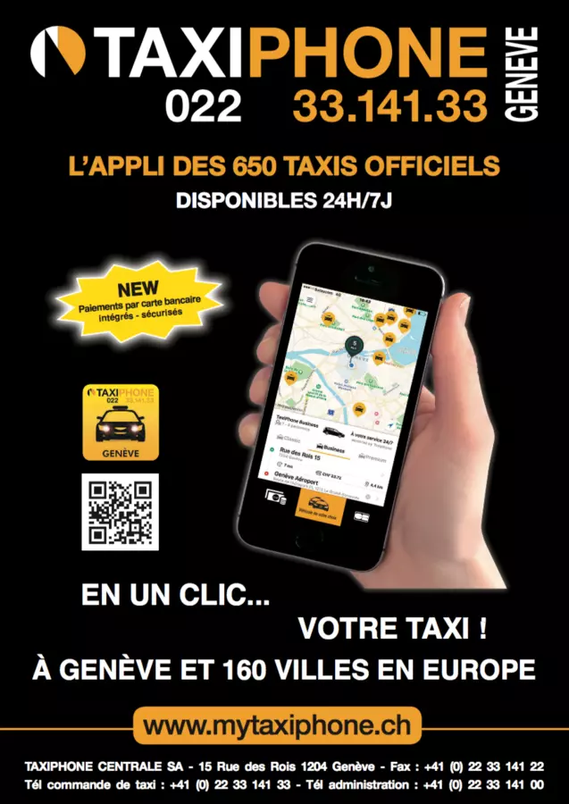 Commandez votre taxi comme vous le voulez : par téléphone au 022 33 141 33 par fax au 022 33 141 22 par internet sur www.taxi-phone.ch par application android https://play.google.com/store/apps/details?id=at.fms_datenfunk.TaxiPhoneGeneve par application iphone https://itunes.apple.com/ch/app/taxiphone-geneve/id509983416Voitures et chauffeurs « sur mesure » : Avec plus de 650 voitures, nous sommes pratiquement à même de répondre à toutes vos exigences.Délais de réponse optimale : Avec plus de 20 téléphonistes et 2 ordinateurs indépendants des pannes de courant, nous assurons un service permanent extrêmement efficace puisque dans la plupart des cas votre taxi arrive en 3 minutes et la course est acceptée en 6 secondes par le chauffeur.En permanence, par n’importe quel temps : Taxi-Phone est le seul prestataire sur le marché genevois à pouvoir vous servir en permanence 24h / 24h, 7 / 7, la nuit, les jours fériés et par n’importe quel temps. Par mauvais temps les délais pour obtenir un véhicule peuvent s’allonger, mais nous vous trouvons un taxi lorsque la concurrence ne répond déjà plus depuis longtemps.TAXIPHONE, le meilleur de la voiture !