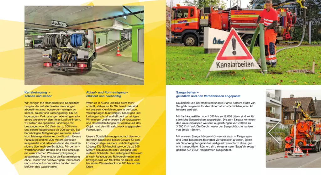 Kanalreinigung, Flächenreinigung, Kanalfernsehen, Kanalsanierungen, Dichtheitsprüfungen, Ablaufreinigung, Rohrreinigung, Strassenreinigung, Mobile WC-Vermietung, Mobile Toiletten, Saugen, Sarnieren
