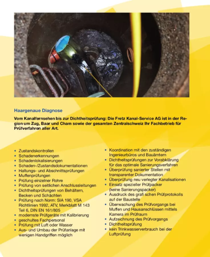 Die Fretz Kanal-Service AG aus Cham im Kanton Zug bietet alles rund um den Kanalisationsunterhalt, etwa Kanalreinigung, Rohrreinigung oder Strassenreinigung sowohl für Privatpersonen wie auch für die öffentliche Hand. Seit 1954 steht unser Ausbildungsbetrieb für zuverlässig gute Arbeit.