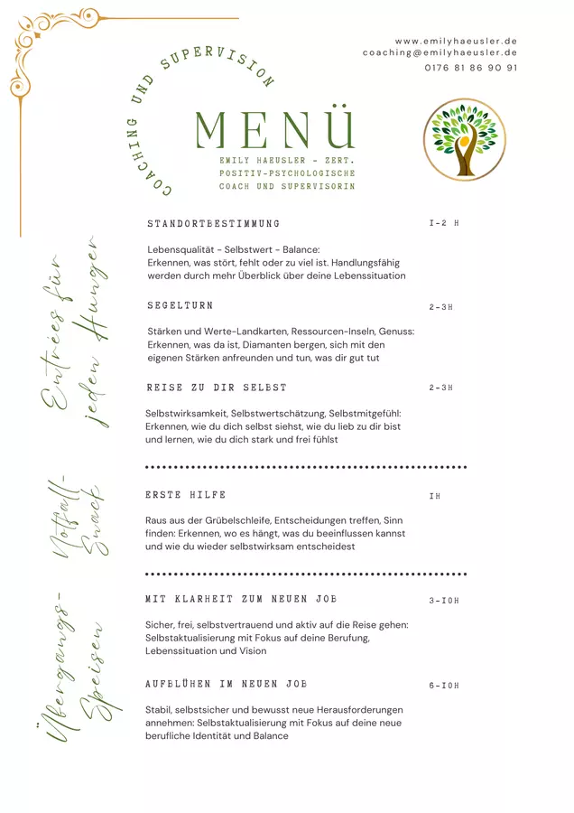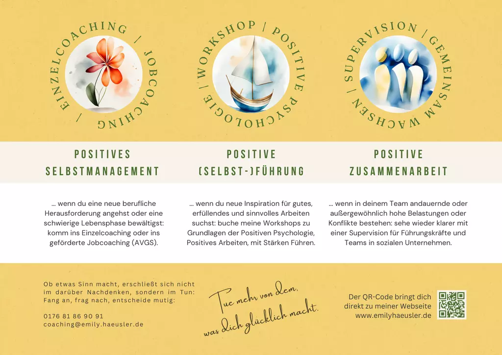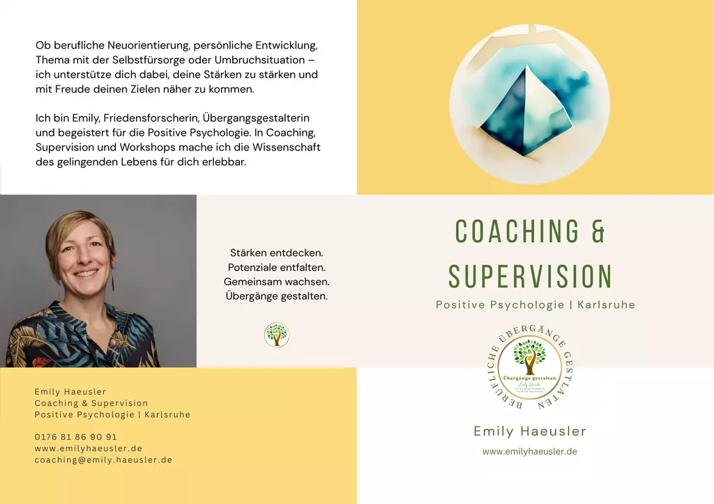 Berufliche Neuorientierung, persönliche Entwicklung oder Umbruchsituation? Emily Haeusler Coaching begleitet Einzelpersonen, Teams und soziale Unternehmen aus Karlsruhe – vor Ort oder online – dabei, Stärken zu entdecken und berufliche Ziele mit Energie und Zuversicht zu verfolgen. Das Angebot umfasst Einzelcoaching für positives Selbstmanagement und Jobcoaching (AVGS), praxisnahe Workshops zur mentalen Gesundheit und Positiven Psychologie, sowie Supervision für Führungskräfte und soziale Teams. Mit wissenschaftlich fundierten Methoden werden Resilienz, Zusammenarbeit und Wachstum gefördert. Übergänge. Positiv. Gestalten.