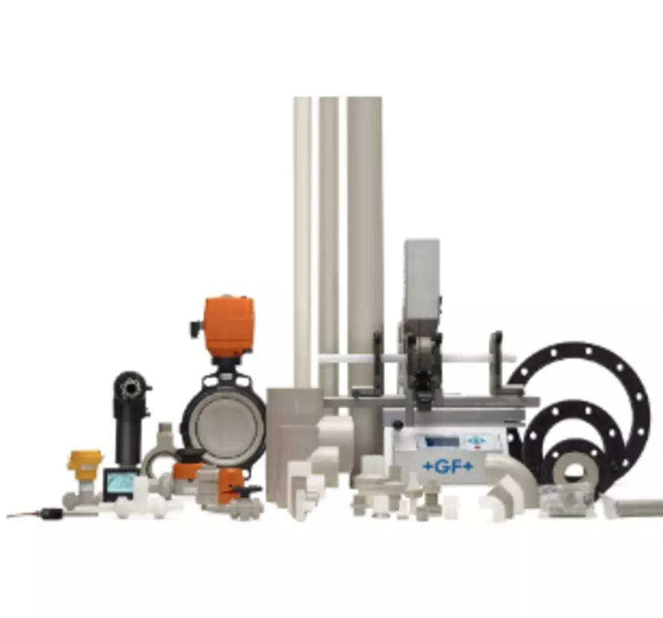 Titan Plastimex dodává plastové potrubní systémy koncernu GEORG FISCHER +GF+ z 8 druhů plastů: PVC-U, PVC-C, PP, PE, PVDF, ABS, PB a PFA.