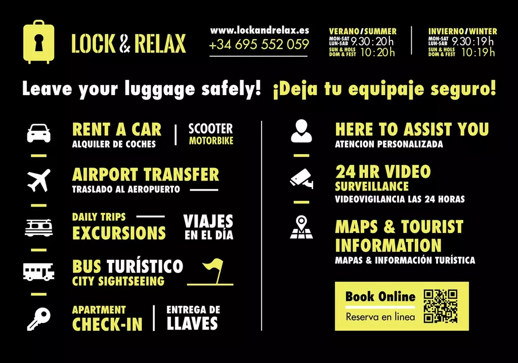 Servicio de consigna de equipaje e información turística. Alquiler de vehículos .S i vienes cargado con maletas te las guardamos en Lock&Relax, justo al lado de la estación y el centro. DISFRUTA DE MÁLAGA SIN PREOCUPARTE POR TU EQUIPAJE. RESERVA ONLINE AHORA