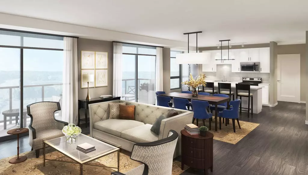 As a resident of our welcoming community, you’ll enjoy access to our sundeck, swimming pool, well-equipped fitness center, and yoga studio. Our apartments fuse elegance with function, from washer and dryer sets to plush carpeting, plank flooring, and quartz countertops. And while the expansive windows surround the gaze with skyline views, the patios or balconies let you enjoy a breath of fresh air. You won’t have to worry about space either – our studio, one, and two-bedroom apartments start at 556 square feet and reach a whopping 1,754 square feet.
