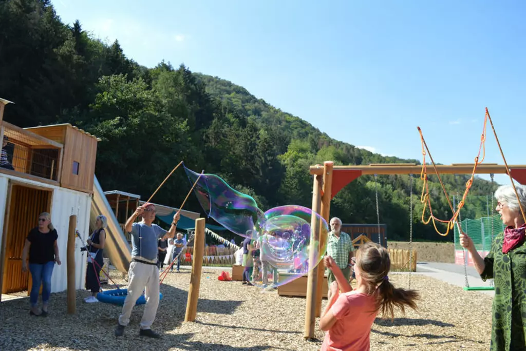 Mit seinem Wildgarten und den Pflanzbeeten bietet das großräumige Kindergartengelände auf der Burgwiese Kindern zahlreiche Bildungsanlässe und viel Platz zum Spielen, Toben und Klettern. Das umfriedete Gelände grenzt an den Waldrand und an einen neu gebauten Spielplatz. Auf dem Kita-Gelände befindet sich ein Bauwagen, indem Kinder bei widrigen Wetterbedingungen Schutz finden und für die Zeiträume der Bring- und Abholzeiten nutzen. Ferner gehört ein Toilettencontainer mit zwei Toiletten zur Einrichtung.