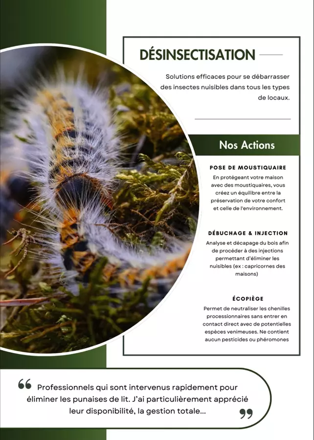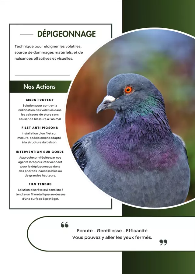 Notre entreprise de désinfection se consacre à fournir des résultats rapides et durables pour éliminer les nuisibles de votre environnement. Nous avons la solution pour vous débarrasser des punaises de lits, cafards, fourmis, araignées, guêpes et frelons. Passionnés par la désinfection et la lutte contre les nuisibles, les régies et les privés nous confient les missions suivantes : dépigeonnage, dératisation (élimination des rongeurs) et des volatiles. Notre équipe d’experts dévoués se compose de professionnels aux parcours variés et complémentaires.Notre équipe d’experts dévoués se compose de professionnels aux parcours variés et complémentaires. Passionnés par la désinfection et la lutte contre les nuisibles, ils possèdent une riche expérience dans divers domaines, notamment la gestion de chantiers pour des régies et des particuliers, le dépigeonnage et le développement de systèmes de protection respectueux de l’environnement.