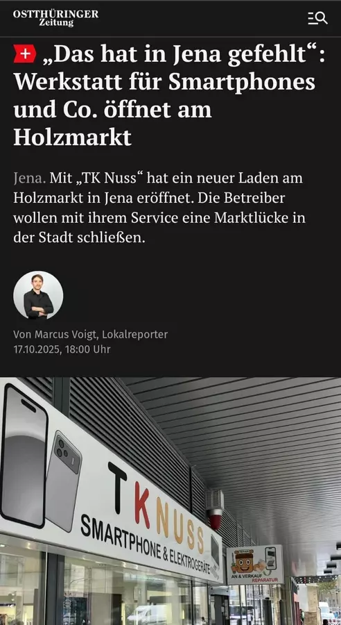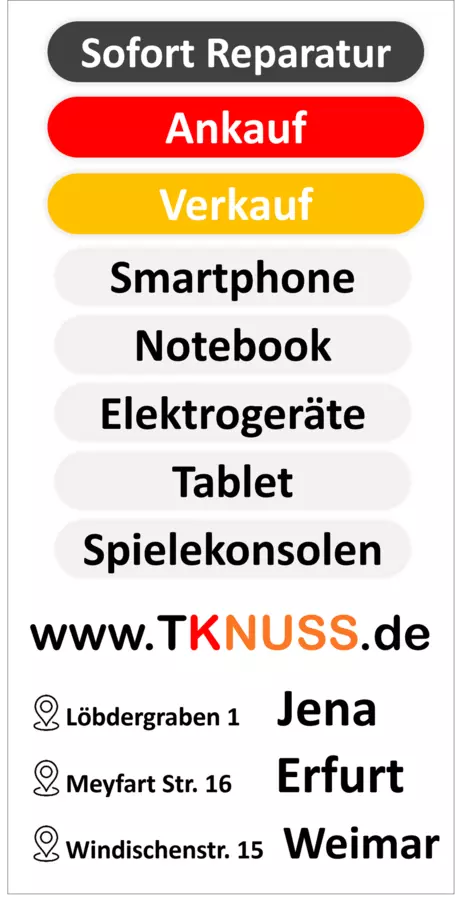 TKNuss SmartFurt 20 Jahre Erfahrung in Technik & Service Ihr zuverlässiger Partner für alle Technik-Fragen in Jena! Seit 2005 bieten wir: Reparatur-Service: Schnelle und preiswerte Reparaturen für Smartphones, Handys, Notebooks und Tablets aller Marken. Ankauf: Wir zahlen faire Preise für Ihre gebrauchten Geräte. Verkauf: Entdecken Sie neue und qualitätsgeprüfte gebrauchte Geräte. Vertrauen Sie auf unsere 20-jährige Erfahrung. Wir freuen uns auf Ihren Besuch im Zentrum von Jena, Löbdergraben 1!