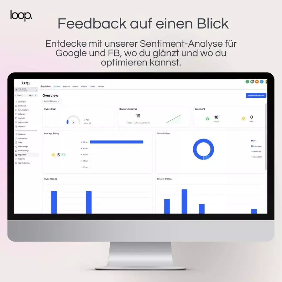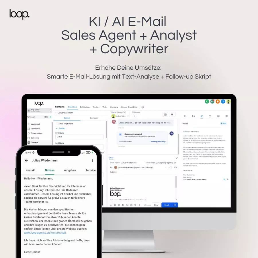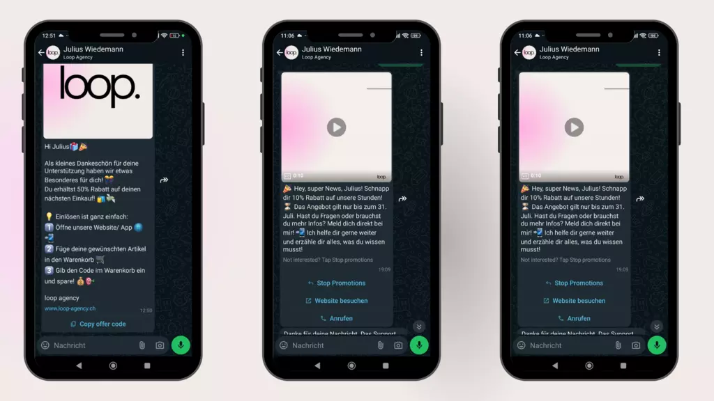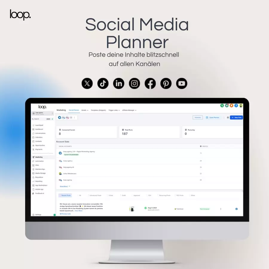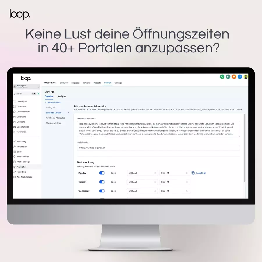 Die loop agency ist Dein Partner für innovative Marketinglösungen in Zürich. Unsere All-in-One Marketing Plattform ermöglicht es Dir, sämtliche Kommunikationskanäle wie Social Media DMs, WhatsApp, Social Media, SMS, Telefon und E-Mail zentral zu verwalten. Durch die Automatisierung von Kampagnen kannst Du personalisierte Nachrichten basierend auf dem Verhalten und den Vorlieben Deiner Kunden senden, was die Kundenbindung stärkt und die Conversion-Raten erhöht. Unsere Plattform erleichtert zudem die Analyse und Optimierung Deiner Marketingstrategien, unterstützt durch datengetriebene Erkenntnisse aus Marketing-AI-Integrationen. Mit unserer Expertise unterstützen wir Dich dabei, Deine Marketingstrategien zu optimieren und nachhaltiges Wachstum zu erzielen.