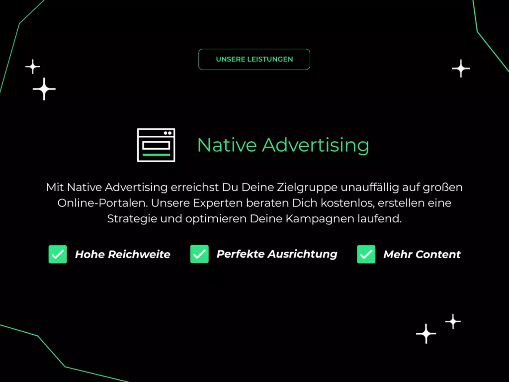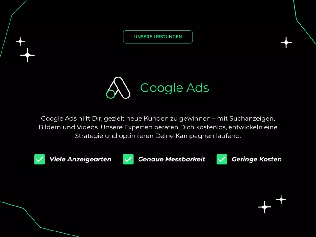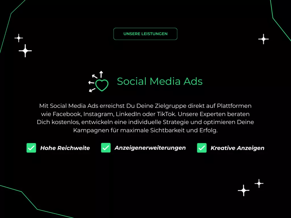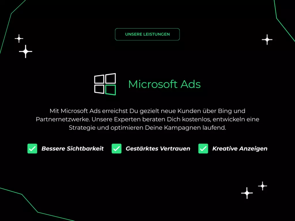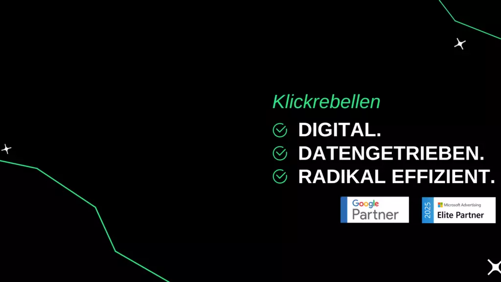 Wir sind die Klickrebellen digital, datengetrieben und radikal effizient. Performance-Marketing ist unsere Spielwiese ob mit Google, Meta oder Microsoft Ads, wir kennen die Mechaniken jeder Plattform genau. Wir analysieren, testen, optimieren mit maximaler Präzision und dem Ziel: messbare Ergebnisse mit echtem Impact. Mehr Klicks, mehr Kunden, mehr Erfolg das ist unser Anspruch. Ob Google Ads, Microsoft Ads, Social Media Ads, SEO, Native Ads, Mitarbeitergewinnung, Webseitenentwicklung, Tracking, Videoproduktion oder Marketing-Beratung wir bieten individuelle Strategien statt Schubladenlösungen. Sichere dir jetzt deine kostenlose Erstberatung!